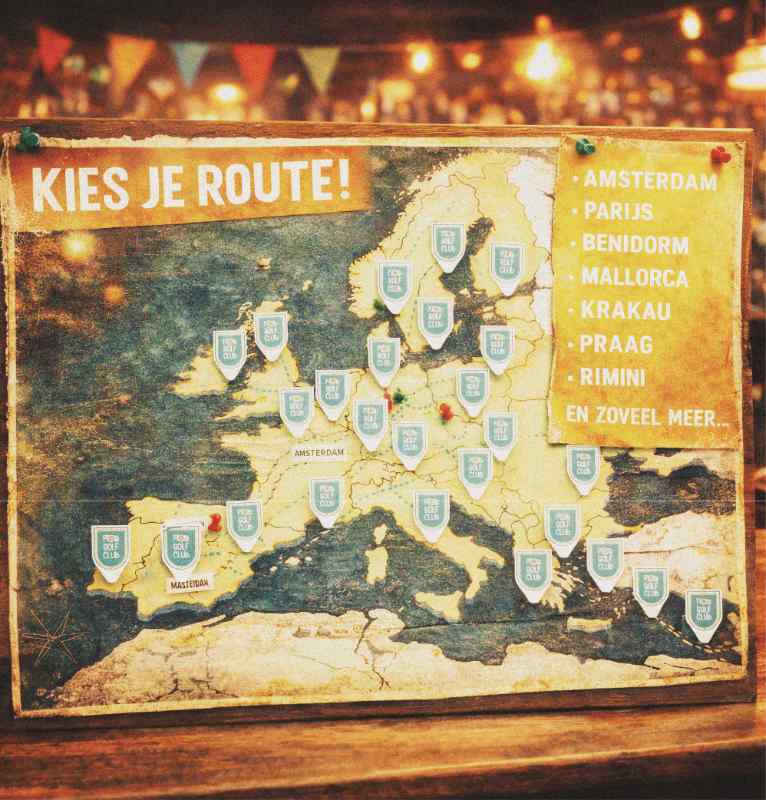 WIJ BIEDEN ROUTES AAN IN 28 STEDEN IN NEDERLAND EN BELGIË. WIL JE PUBGOLF SPELEN IN JE EIGEN DORP OF STAD? ZORG ER DAN VOOR DAT JE EEN ROUTE KUNT MAKEN LANGS 9 OF 18 BARS OF CAFÉS.